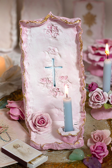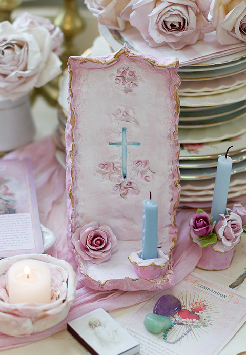 Hand-formed in air dry clay, this piece is finished in soft white with pink and gold edging. Each altar features a hand-sculpted rose and a subtle blue cross integrated into the surface—symbols of presence, reflection, and intention.