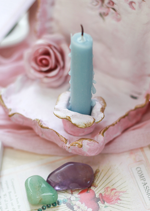 Designed to hold a tiny candle, it creates a soft, grounded focal point for stillness, prayer, meditation, or daily ritual. This piece includes a meditation candle, a violet ritual stone, oracle card, and a set of matches.